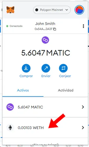 15. Al verificar el saldo de WETH de nuestra wallet y efectivamente solo ha descontado el importe del NFT sin cargos adicionales como el “Gas Fee” que tiene costos elevados al comprar en la red Ethereum