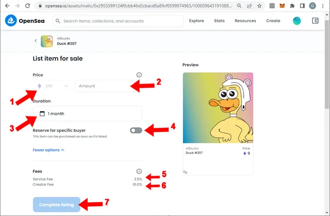 - Cuando la venta se realiza OpenSea descontará 2.5% de comisión por sus servicios de Marketpalce, mientras que también se descontará otro 7% en concepto de regalías que OpenSea transferirá al creador del NFT. Estos valores necesitas extraerlos del pie del formulario de venta, lo veremos a continuación
