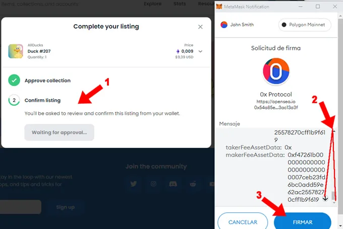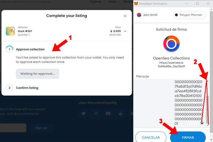 4. Solicita aprobar la colección de NFT por única vez (1). Sobre la wallet solicita la aprobación, si pones a la venta otro item de esta colección ya no solicitará este paso. Deberías leer el mensaje que muestra en la wallet e ir hasta el final (2) . Al llegar al final del mensaje habilitará el botón “Firmar” (3) para que pueda completarse la operación, necesitas presionarlo.