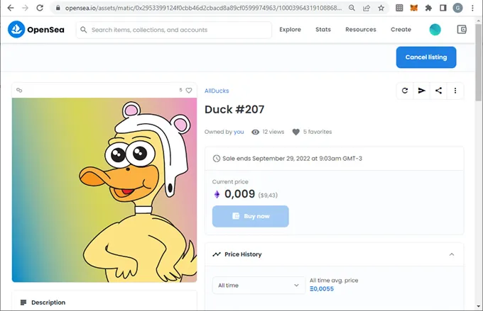 6. Presionar “View listing”, entonces muestra el NFT en venta