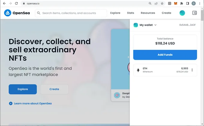 6. OpenSea se ha conectado con la wallet y todo está listo para comprar tus NFTs
