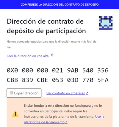 ALERT: Do not deposit ETH in this wallet as it will cause the loss of your funds, if you want to participate in staking you must follow the steps indicated in the provided URL